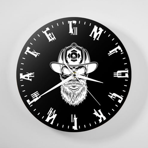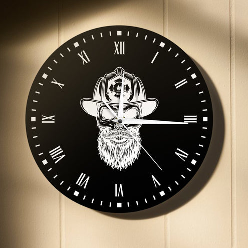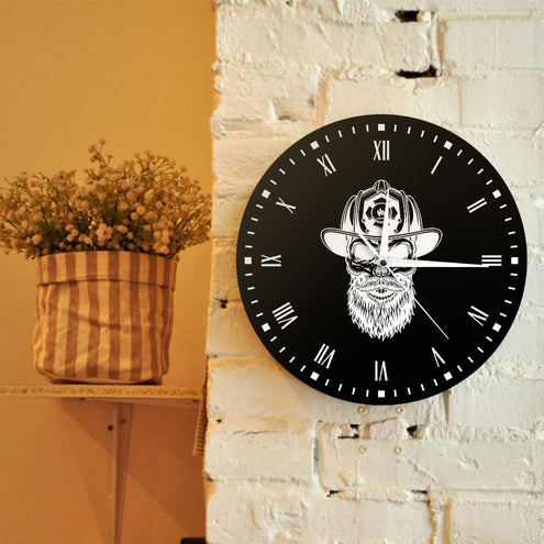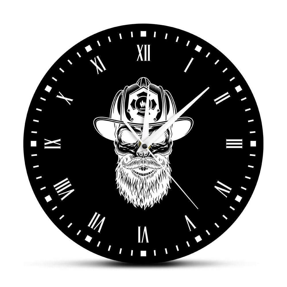 Firefighter Hipster Beard Skull Wall Clock Fire Dept.Wall Decor Retro Gentleman Skull Head With Roman Numberals Firemen's Gift
